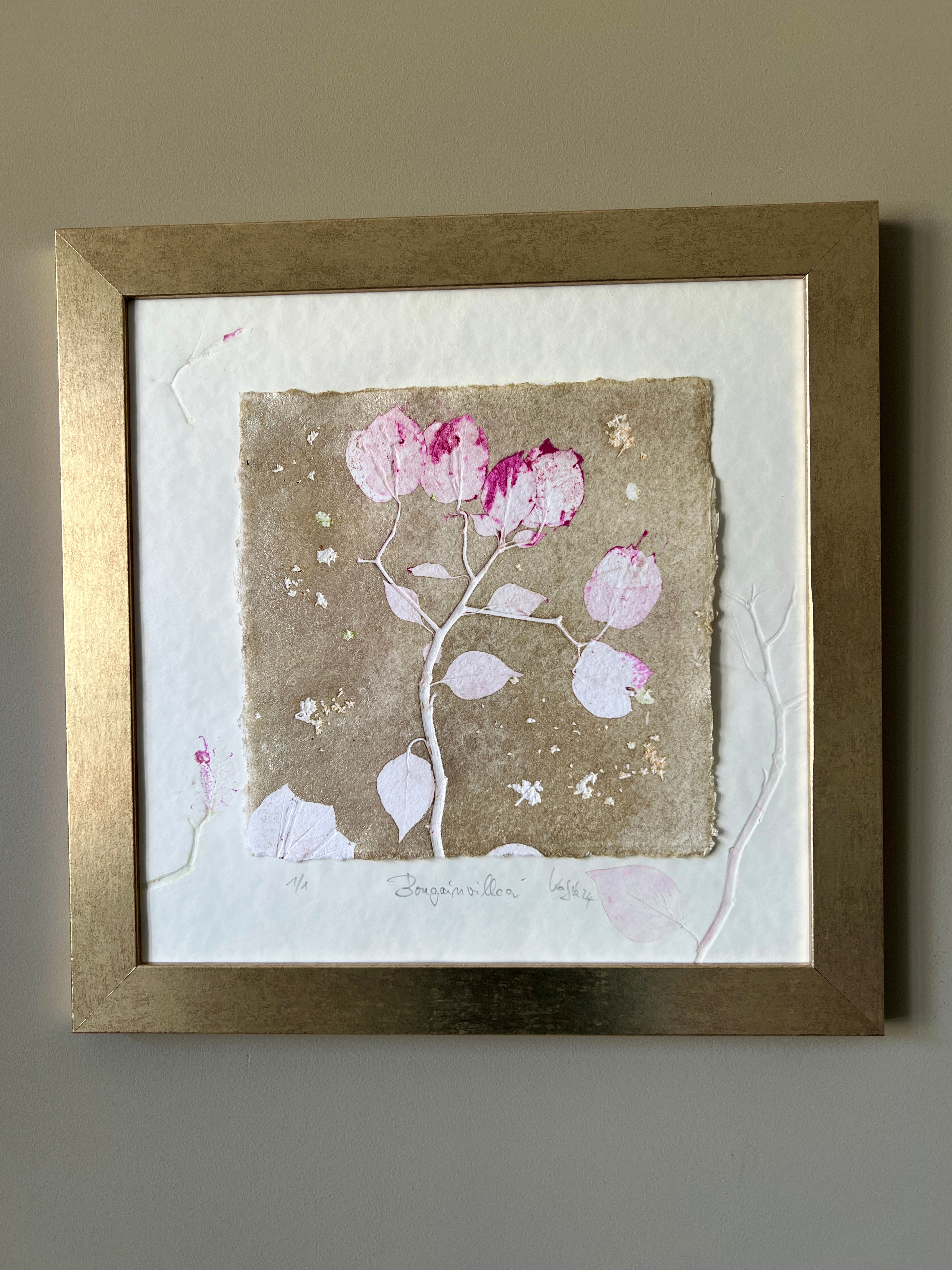 BOUGAINVILLEA Originaldruckgrafik Monotypie Reliefdruck 30x30 cm im Rahmen mattgold