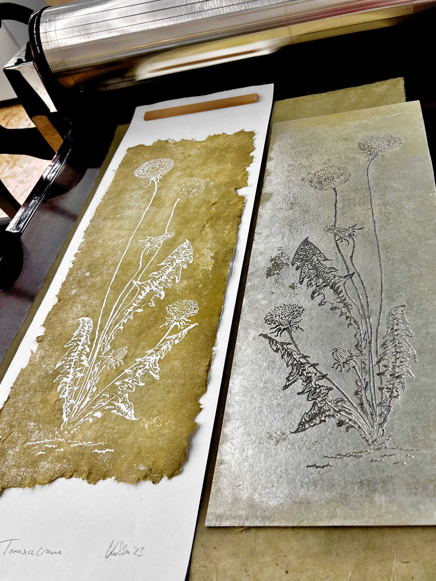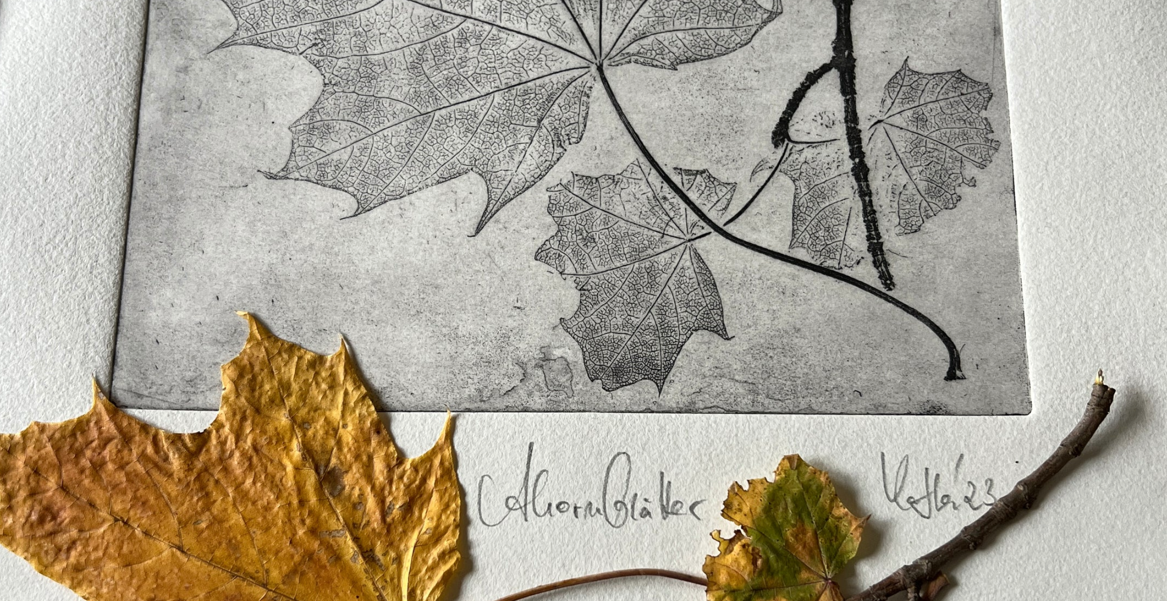LORBEER Originaldruckgrafik Monotypie Reliefdruck 30x30 cm im Rahmen mattgold