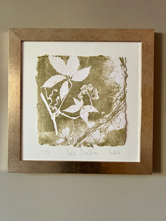 WEINREBE Originaldruckgrafik Monotypie Reliefdruck 30x30 cm im Rahmen mattgold