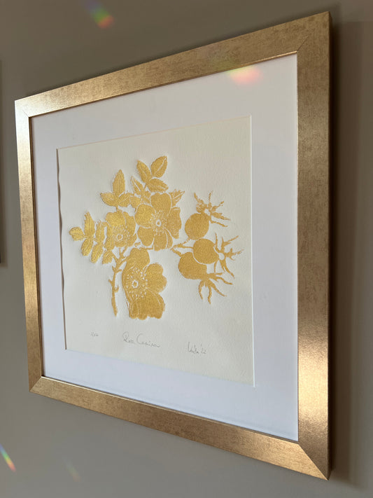 x HAGEBUTTE Originaldruckgrafik Gold-Reliefdruck im Rahmen mattgold mit Passepartout 50x50 cm
