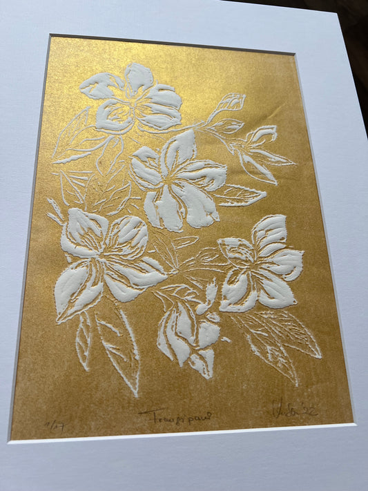 x FRANGIPANI Originaldruckgrafik Gold-Reliefdruck im Passepartout 30x40 cm