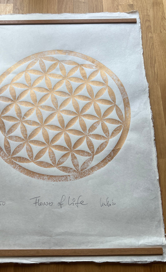 _FLOWER OF LIFE Originaldruckgrafik auf Himalaya Papier 70 x 100 cm, Teakholz Aufhängung