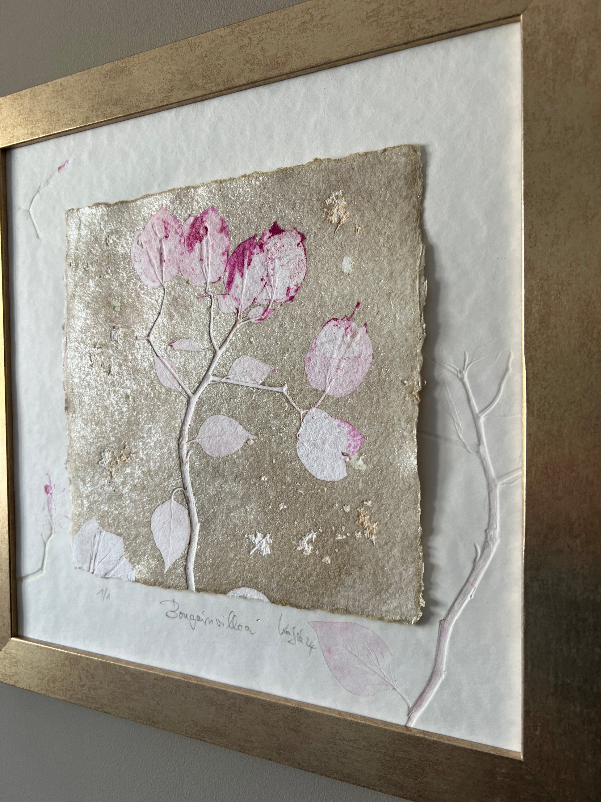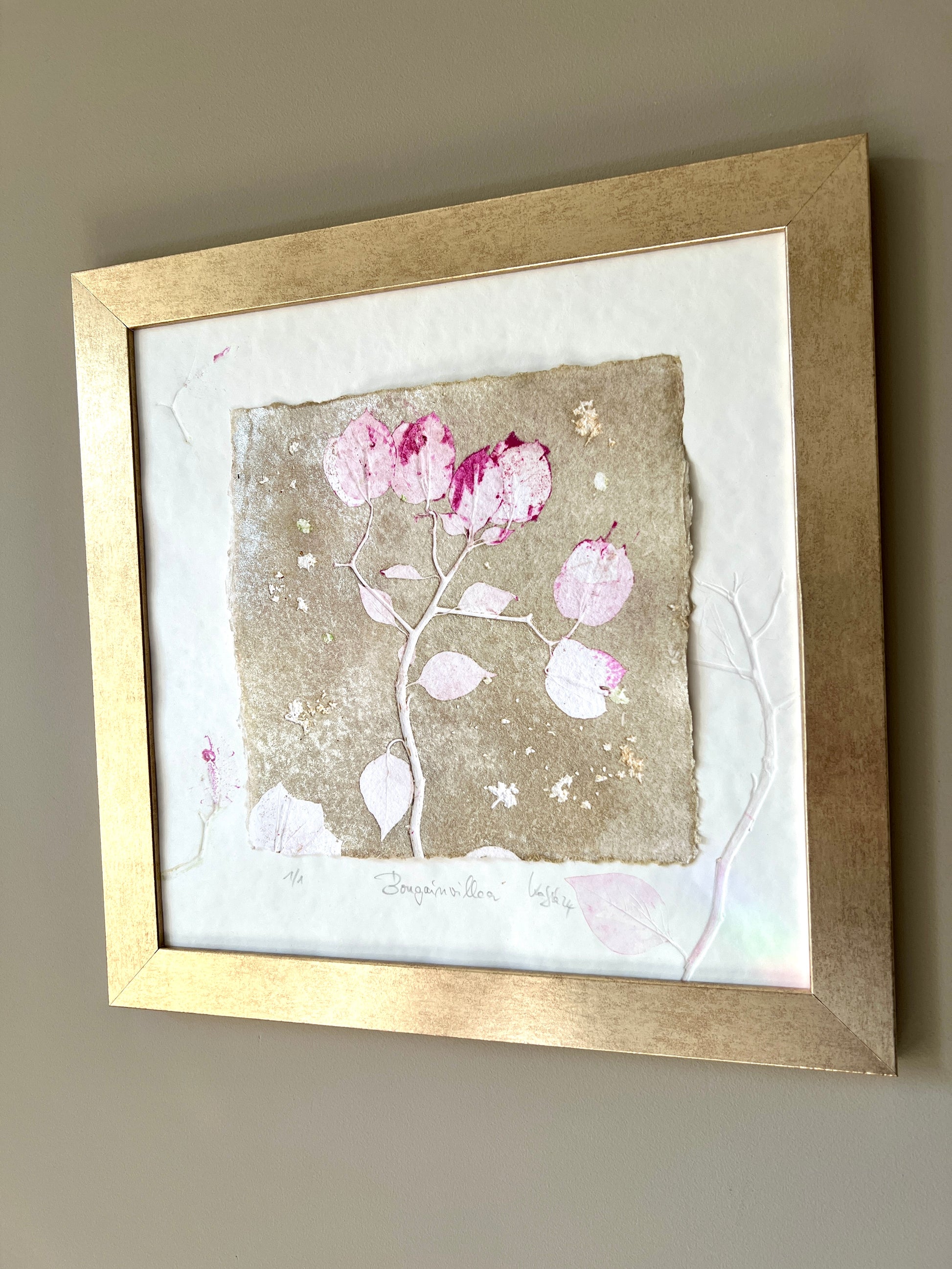 BOUGAINVILLEA Originaldruckgrafik Monotypie Reliefdruck 30x30 cm im Rahmen mattgold