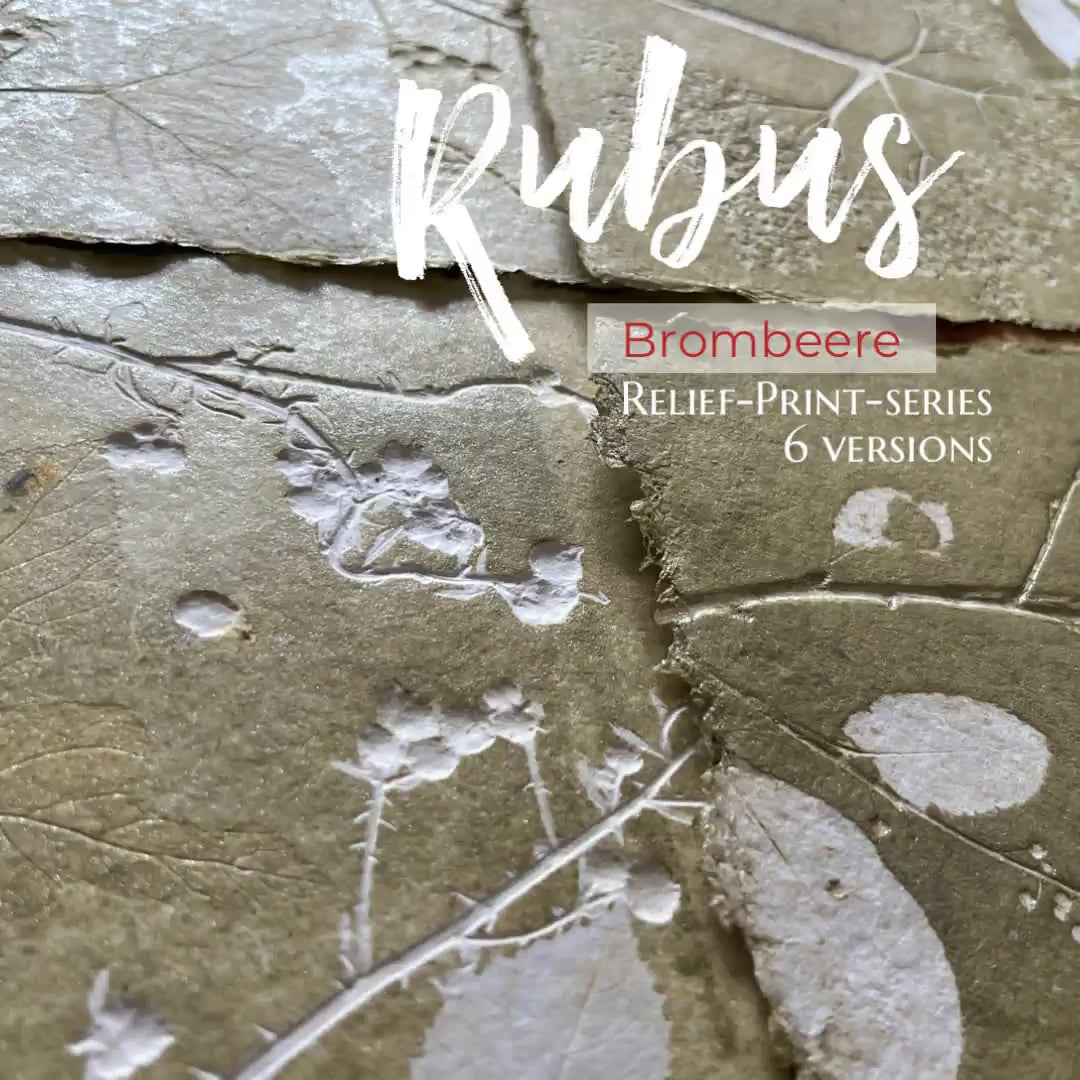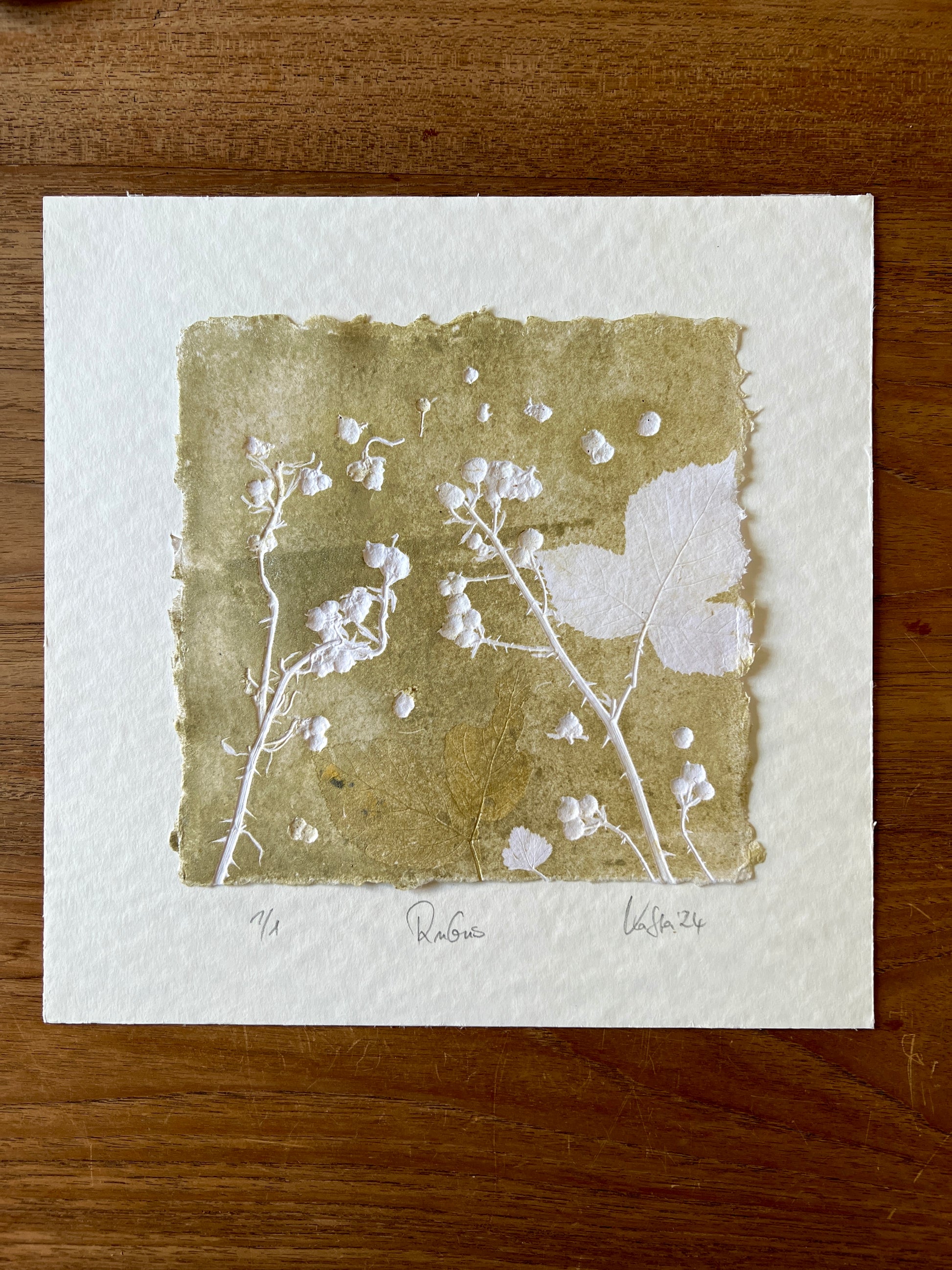 BROMBEERE Originaldruckgrafik Monotypie Reliefdruck im Rahmen 30x30 cm mattgold