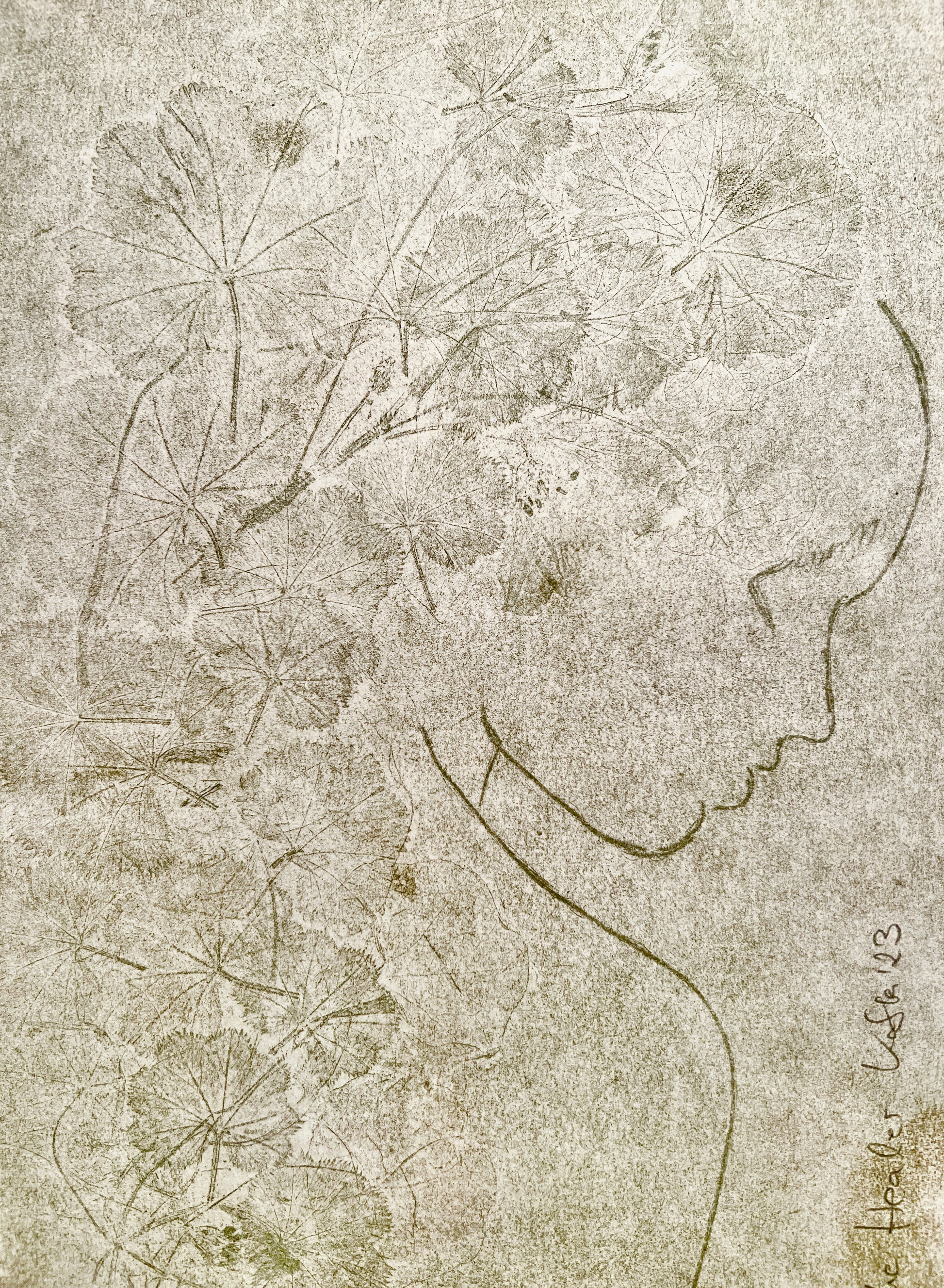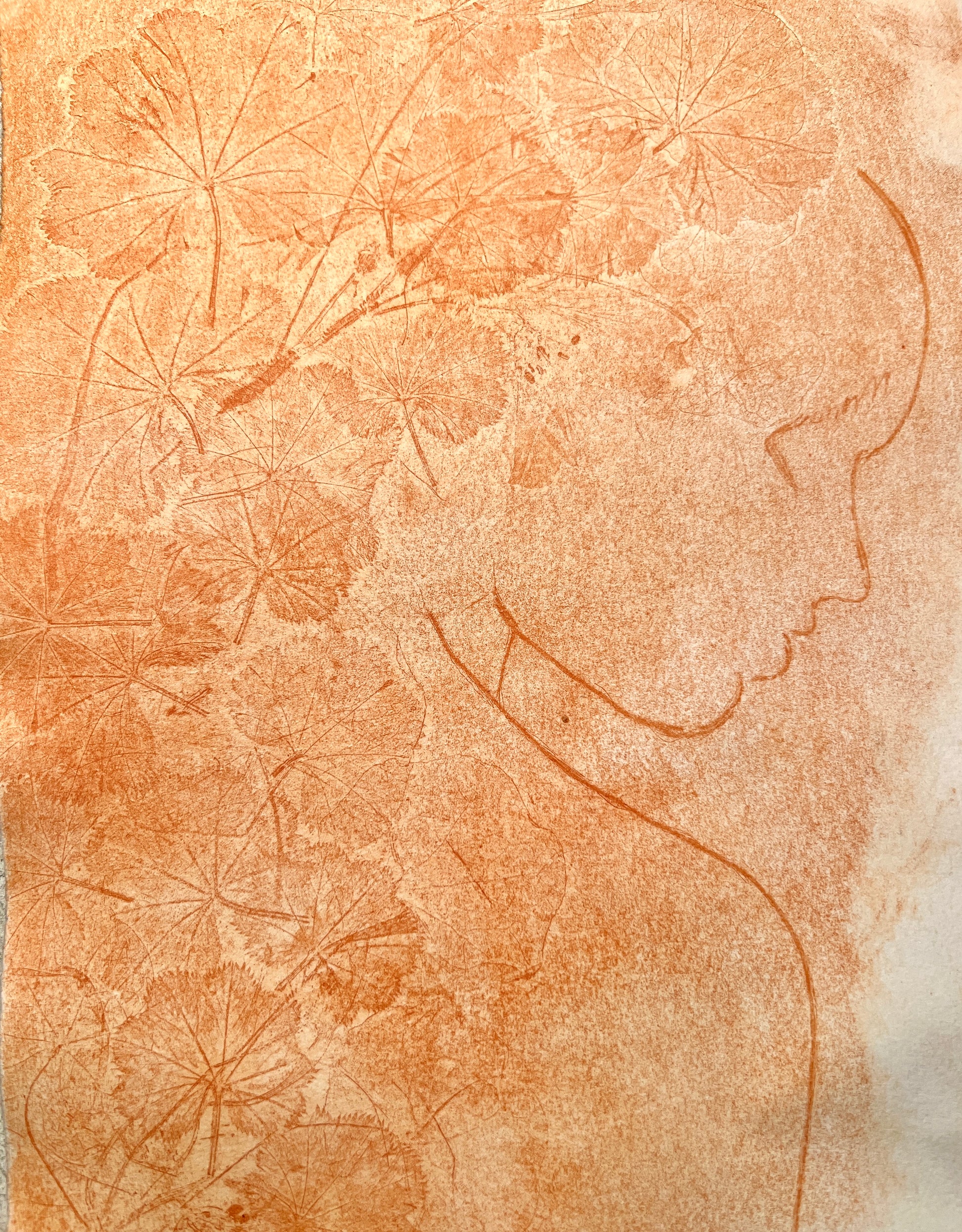 Vernis mou Radierung von gepressten Frauenmantel-Blättern und Kapuzinerkresse-Blüten. Eine Weichgrundätzung auf Zinkplatte, Tiefdruck auf 300 g/qm Kupferdruckkarton im Passepartout Format 30 x 40 cm. In verschiedenen Farben erhältlich. Auch in Wunschfarbe. Bitte anfragen. Jeder Druck ein Unikat.