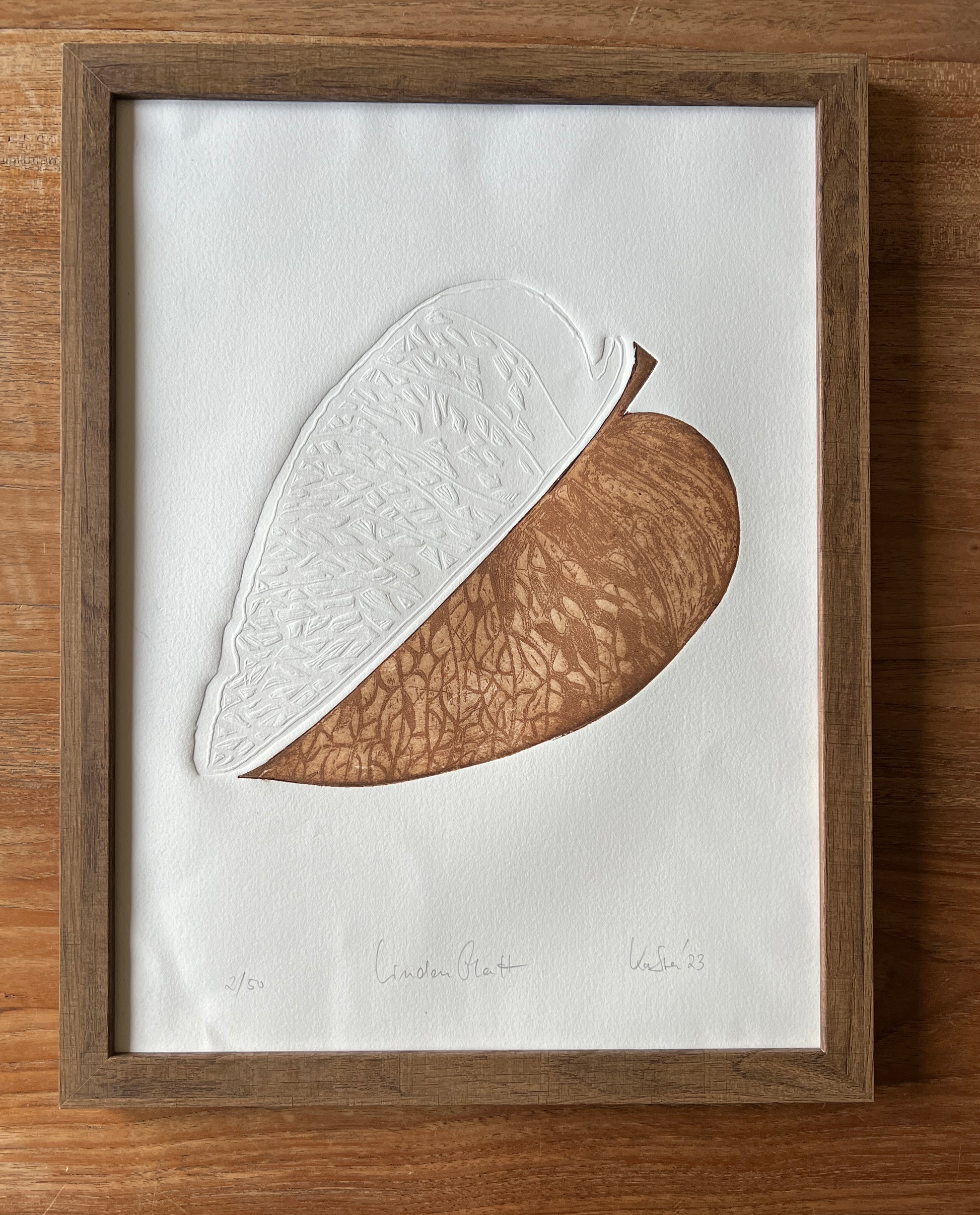 LINDENBLATT Originaldruckgrafik Radierung mit Prägung im Rahmen 30x40 cm