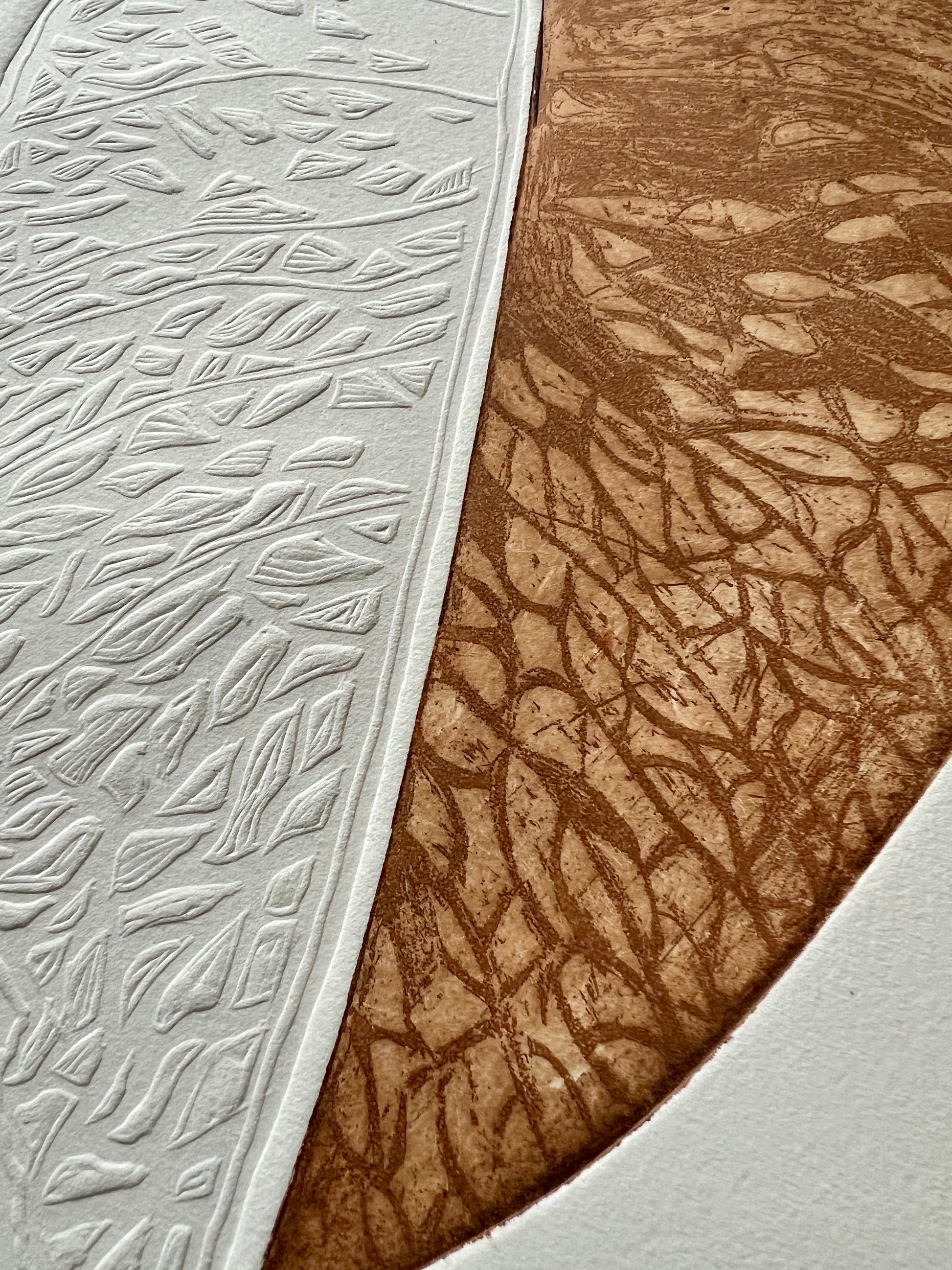 Mixed media Radierung + Blindprägung, Druck auf Büttenpapier von zwei Platten: Zink + Linocut, im Naturholz-Rahmen 30 x 40 cm, Auflage 50